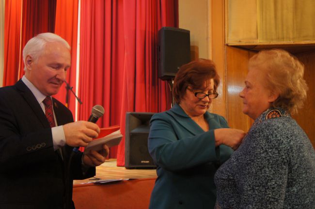В ДК Карла Маркса была приглашена Ветеран Великой Отечественной войны, труженик тыла Солонина Татьяна Никитична, которой 1 января 2017 года исполнилось 90 лет. Татьяна Никитична с 1963 года по настоящее время является активным членом первичной организации КПРФ «Весенняя». Не смотря на свой почтенный возраст, занимается распространением газет, приезжает на митинги и пикеты в Москву, всегда в первых рядах на мероприятиях, проводимых Подольским городским отделением КПРФ. Татьяна Евдокимовна, по поручению депутата Московской областной Думы Наумова А.А., торжественно вручила ей Почетный знак Московской областной Думы «За труды».
